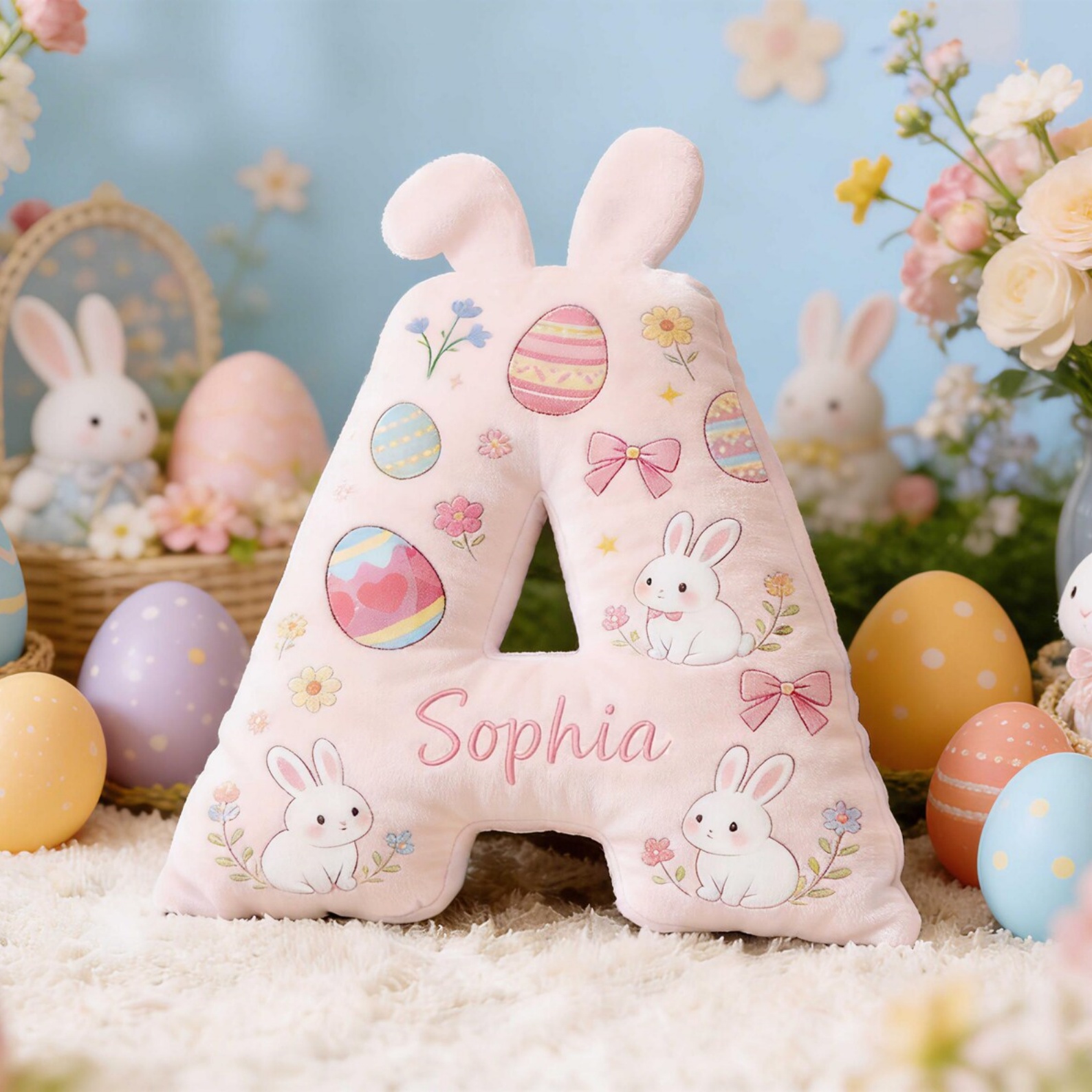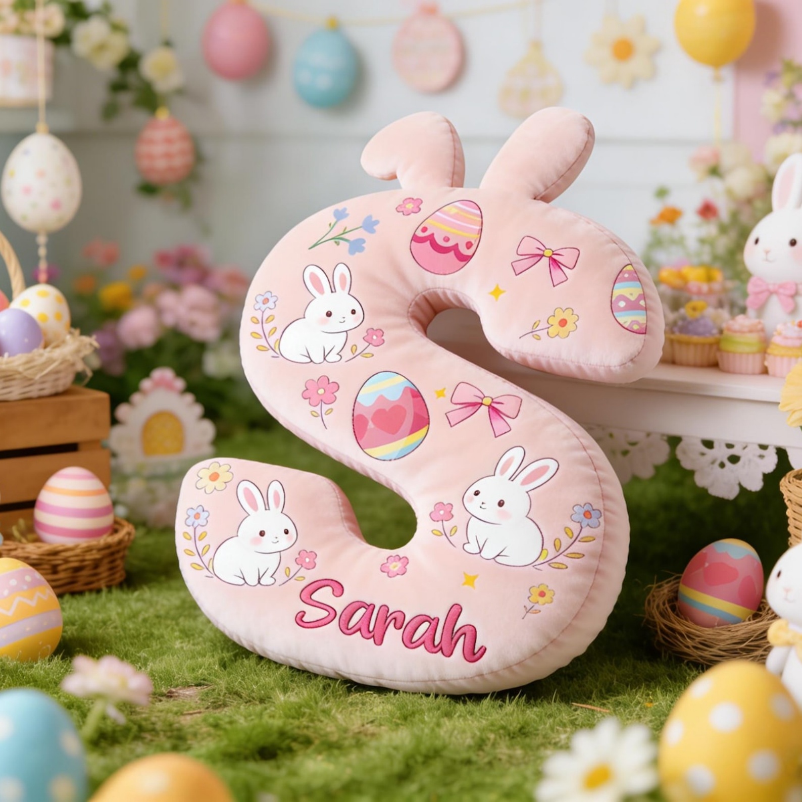 Easter Bunny Ears Alphabet – This plush pillow features a soft, 3D letter pillow with adorable ears. The design is decorated with cute bunnies, colorful eggs, and floral patterns in pastel tones, creating a sweet springtime look that brings joy to any child’s space.